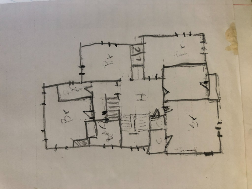 The Holbrook house needed a serious project. From the day I first walked the house in 2016 almost 2 years before we took ownership I had been planning the future renovation. The first night I saw the house I sat down with a notebook and started to sketch the house’s floor plan. I had a habit of taking videos of houses I went to tour and they proved helpful. I wanted to think through where would an en suit go and how would that effect the original floor plan.