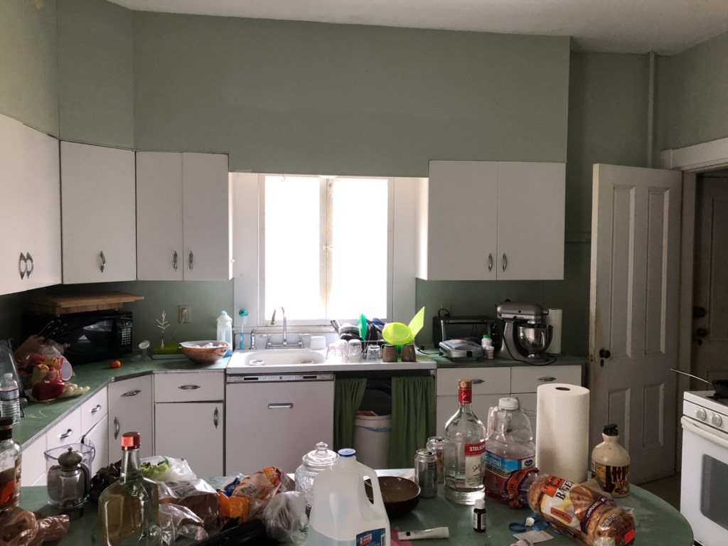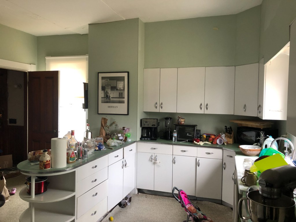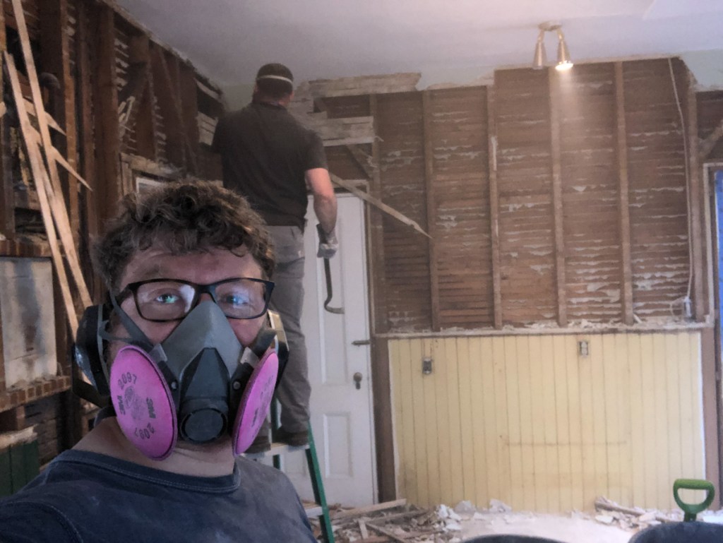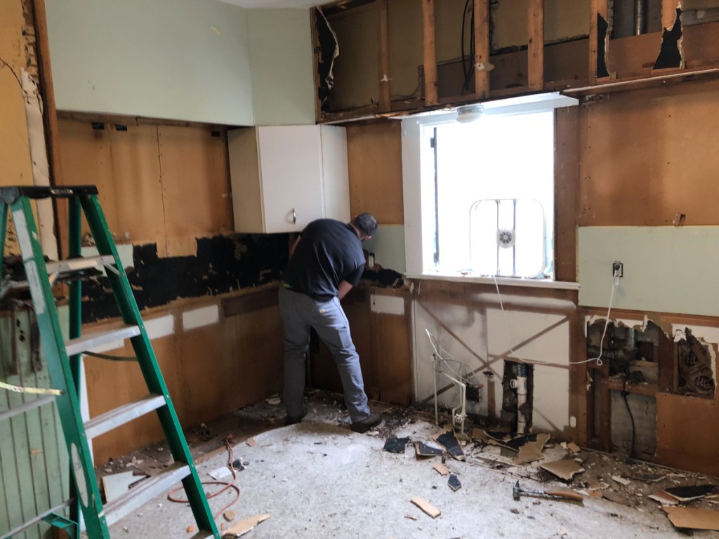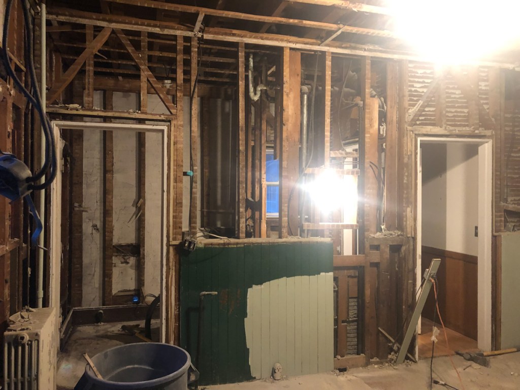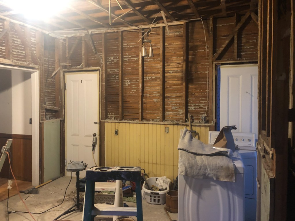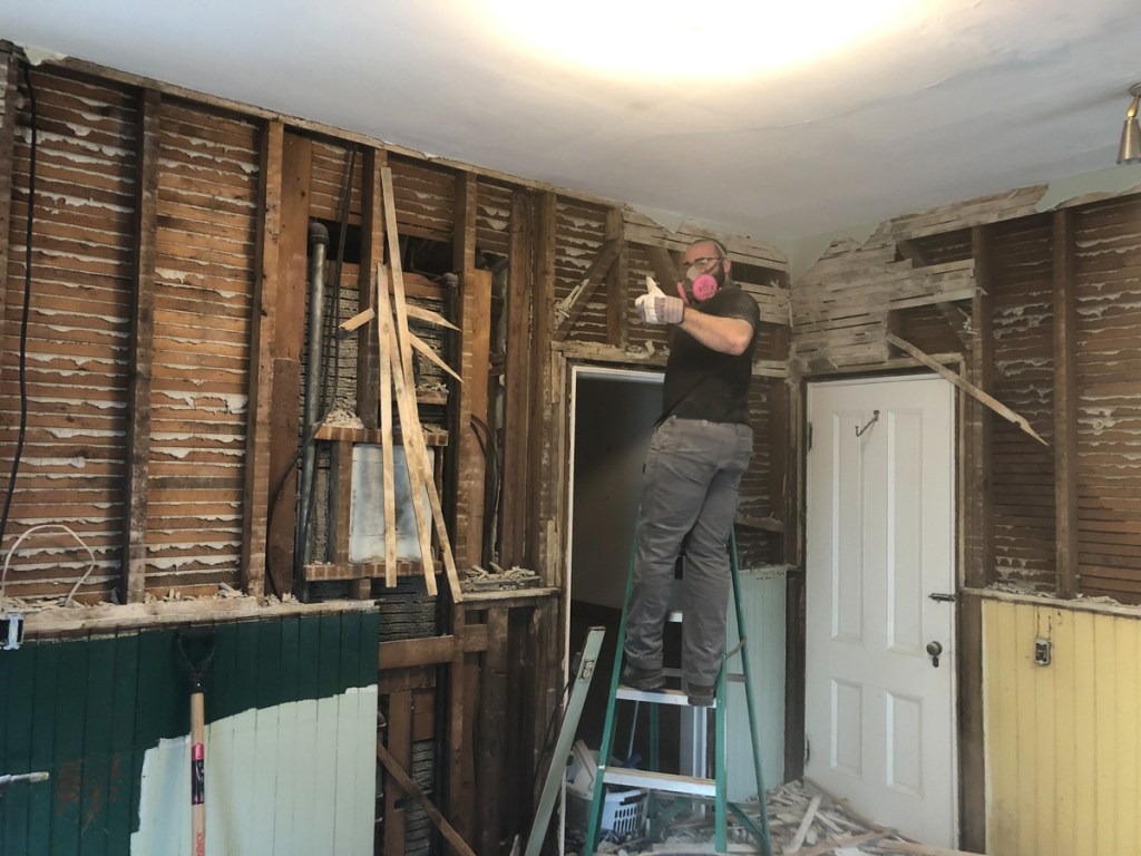 So with the stage set we dismantle – Its demo day April 22, 2019. I will go back to the boring parts of planning in my next blog. That 1950’s kitchen I restored into operation… My buddy Dan and I grabbed some demo equipment namely a 20lb sledge hammer and wielded Thor on that kitchen! Pulled the ceiling to the floor, pulled the cabinets from the walls, ripped layers of lath and plaster, 1950’s soffits, original walnut wainscoting, counters, sink, linoleum… We gutted that kitchen.