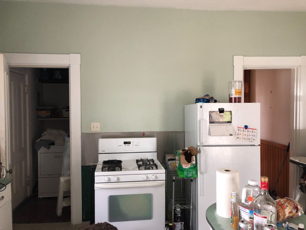 We moved the laundry from the back door to the basement and gutted that pantry and its laundry chute (long sealed off) and shelves. Remnants of the old butlers pantry and hardware now exposed (long removed not by me – glass doors, icebox door and other moldings identified in the barn).