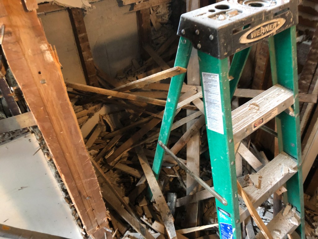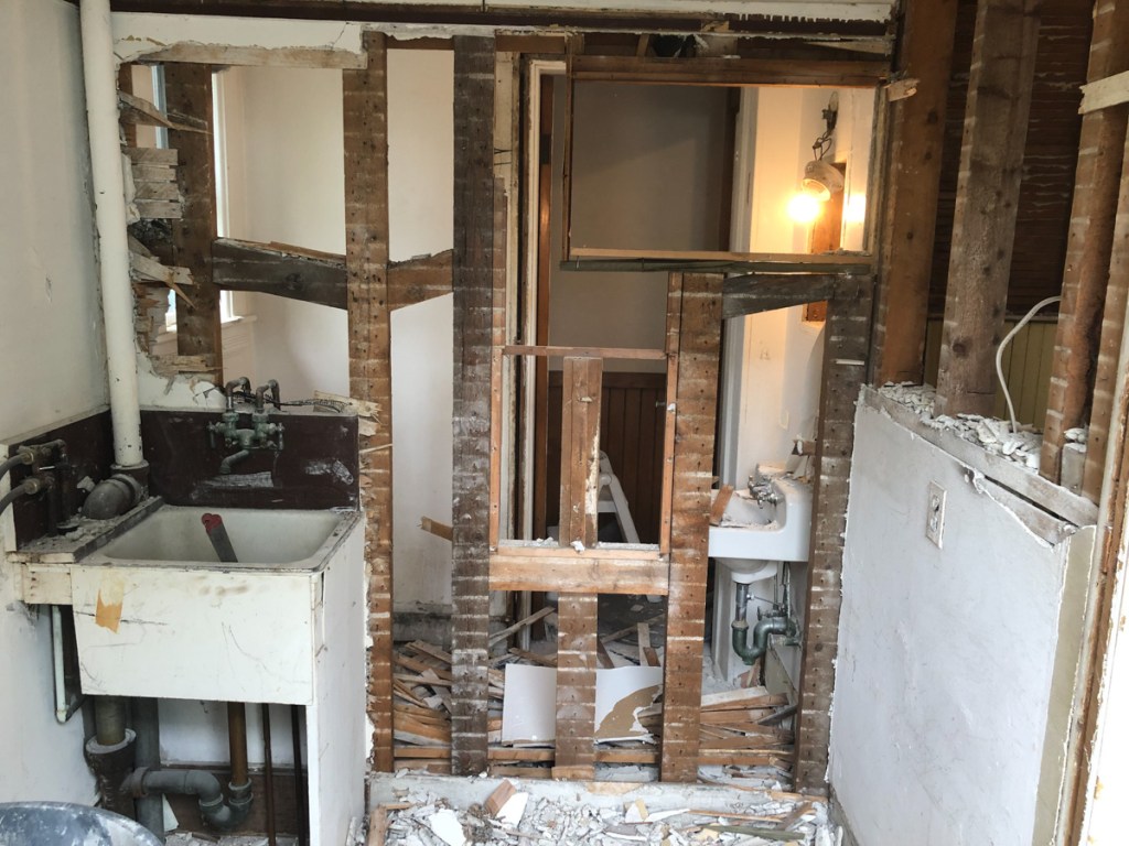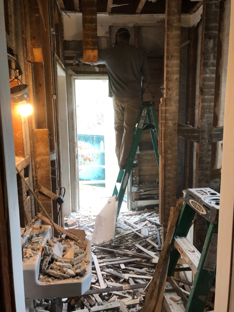 We sacked the powder room once part of the pantry the ceiling, walls, floor, window, until you could not walk. It was like a bomb exploded every once and awhile I would stop. Dan who’s no stranger to the gym and physical might laid waste to anything trying to hold onto a stud our a joist. The room was full of plaster and 100+ year old dust.